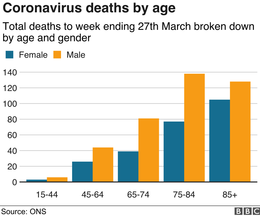 Moving onto Diet; this must be a consideration, with the high consumption of red meat, white rice, white potatoes and white Pasta, but not forgetting the low quality of food that had to be accepted after the 2008 crash, that we are still consuming now 12 years on! Further, the lower consumption of vegetables & fruit and or a wide variety of vegetables, these are not simply a cultural issue, they are a social one permeating all races and social classes in the western world. With the creation of the 24 hour society and the increasing levels of poverty due to the continually decreasing levels of pay, in conjunction with rising food and product prices. (Interestingly, big business have openly stated that they have made more money in the years following the 2008 crash than they made before!). Though further with the creation of such companies as ‘Just eat’ and ‘Deliveroo’ has only magnified the ensuing 10.5 Tsunami that is sweeping through the population, with heart disease, digestive disorders, and the modern Syndromes such as Fibromyaglia, ME and Crohn’s disease, moreso though, stress, lack of sleep and the less known overgrowth of gut flora are among a myriad of issues that illustrate that diet does play a part in weaker immune systems. Also, poor air quality and general pollution are invisible but still a very real factor! In these uncertain times, it would be prudent to try to learn what has lead to the modern malaise of general ill health? But, one further big factor that has become a casualty of the current and complacent belief that it has ‘never been a better world’, is exercise! Your grandparents or great grandparents understand these issues and that consumerism, over industrialisation, over the counter Pharmaceuticals, unnecessary use of antibiotics and dubious advertising in the name of profit are erasing simple wisdom? Moving onto the situation of genetic traits, these are also factors that cannot be dismissed easily, though diabetes is not a genetic trait per se, some ethnic groups are more prone to this illness and it does run in families. My final data comparison in this article is age. There are two considerations with regard to age and age groups in relation to Covid 19, which are, population age and risk in relation to age groups. In a BBC news report according to ONS figures, by week ending 27th March 2020, as seen in the chart below, from the age of 45 years the number of Corona virus deaths increases dramatically and if this was not alarming enough, deaths among the Male population being double that of Women! Although it has been stated by Italian Doctors that in their experience, with contracting and suffering the worst effects of the disease, that age was not a factor? In contemplating this data could you interpolate in the coming Winter, that the cold and flu season would result in lower immunity, from that greater susceptibility? Common sense, increasing your understanding, Knowledge and preparedness, these are our tools and our weapons for fighting this assassin.